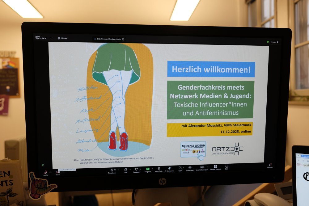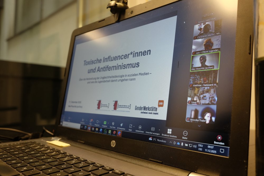 Am 11. Dezember 2025 fand online via Zoom das letzte Netzwerktreffen dieses Jahres unter dem Titel „Toxische Influencer*innen & Antifeminismus – Über die Verbreitung der Ungleichheitsideologie in sozialen Medien und wie die Jugendarbeit damit umgehen kann“ statt. Das Netzwerktreffen war ein Zusammenschluss des Genderfachkreises und dem Netzwerk Medien & Jugend. Knapp 60 Fachkräfte der Jugendarbeit setzten sich mit Herausforderungen im digitalen Raum auseinander. Ziel war es, die Teilnehmenden für die Mechanismen des digitalen Antifeminismus zu sensibilisieren und konkrete Handlungsmöglichkeiten für die Arbeit mit jungen Menschen zu vermitteln.