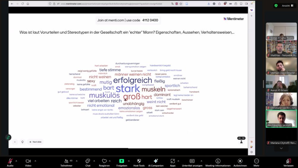 Nach einer kurzen Pause arbeiteten die Teilnehmenden in Breakout-Sessions, um sich über ihre Beobachtungen und Erfahrungen auszutauschen. Anschließend folgte ein praktischer Methodenblock, der für die Arbeit mit Jugendlichen genutzt werden kann: Bei der Methode „Real Men“ wurden stereotype Rollenbilder hinterfragt und persönliche Vorbilder reflektiert. Weitere Methoden wie „RelationSHIP“ wurden vorgestellt, ebenso wie Podcasts und Methodenbücher zur Vertiefung der Themen.