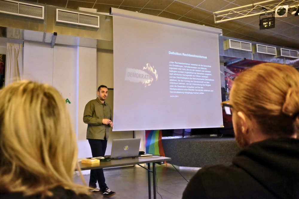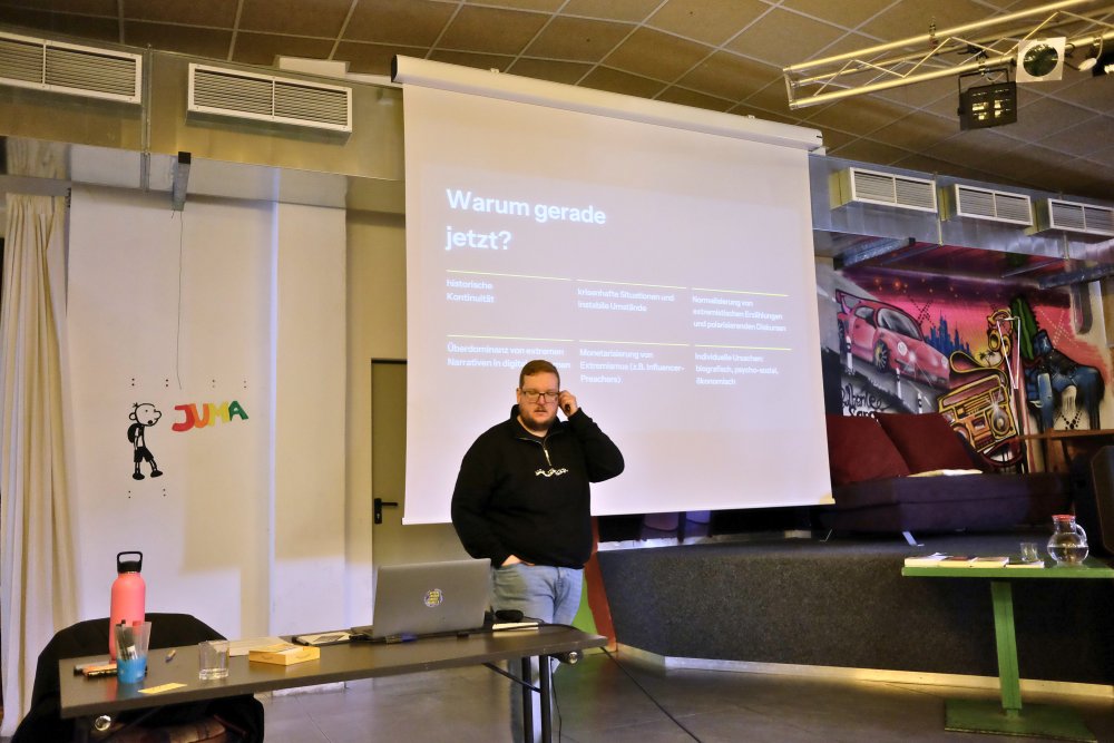 Der Vormittag bot einen fundierten fachlichen Input: Thomas Kobler beleuchtete politischen Extremismus mit Schwerpunkt Rechtsextremismus, während Alexander Fontó religiös begründeten Extremismus u.a. wie Dschihadismus und Islamismus für die Fachkräfte der Jugendarbeit einordnete. Neben Begriffsdefinitionen und ideologischen Hintergründen wurde auch ein aktueller Überblick über Entwicklungen und deren Relevanz für Europa und die Jugendarbeit gegeben.